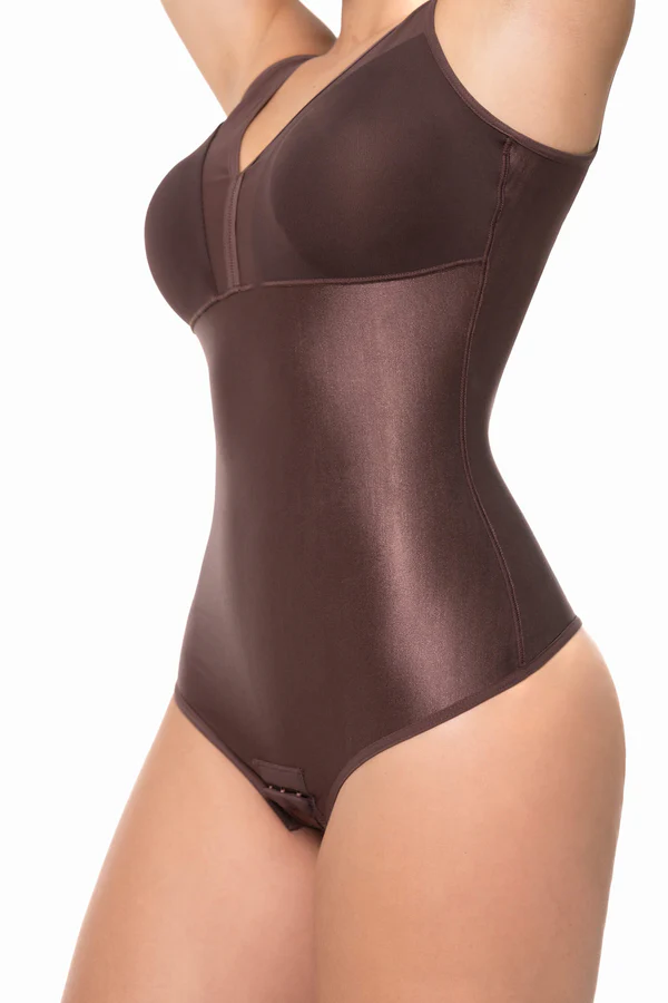 The sheer detail at the neckline and the clean leg cuts add a feminine and elegant touch, ideal for wearing as outerwear or underwear. Its high-coverage back helps conceal any bulges in this area, creating a more streamlined and harmonious silhouette. Plus, its anatomical closure ensures all-day comfort.