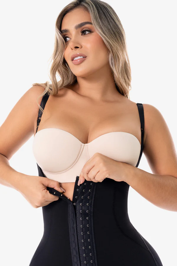 This open-bust shapewear is designed for those seeking complete shaping that transforms their silhouette from the very first wear. Its sleeves help define the arms, smooth underarms, and control the upper back, while its semi-hourglass structure works to make the waist appear smaller and enhance the buttocks and hips, achieving a firm, rounded lift that balances the entire figure.
